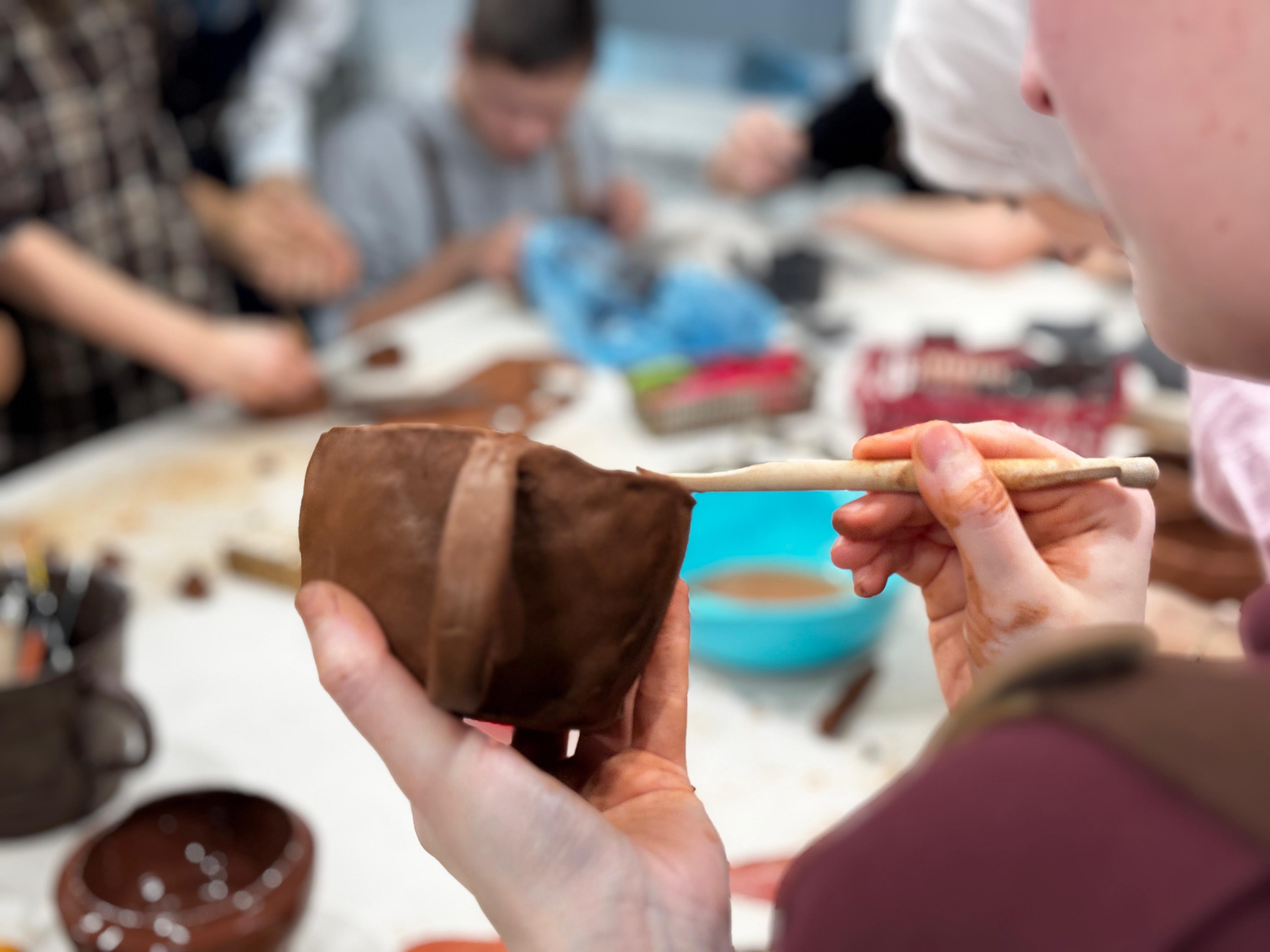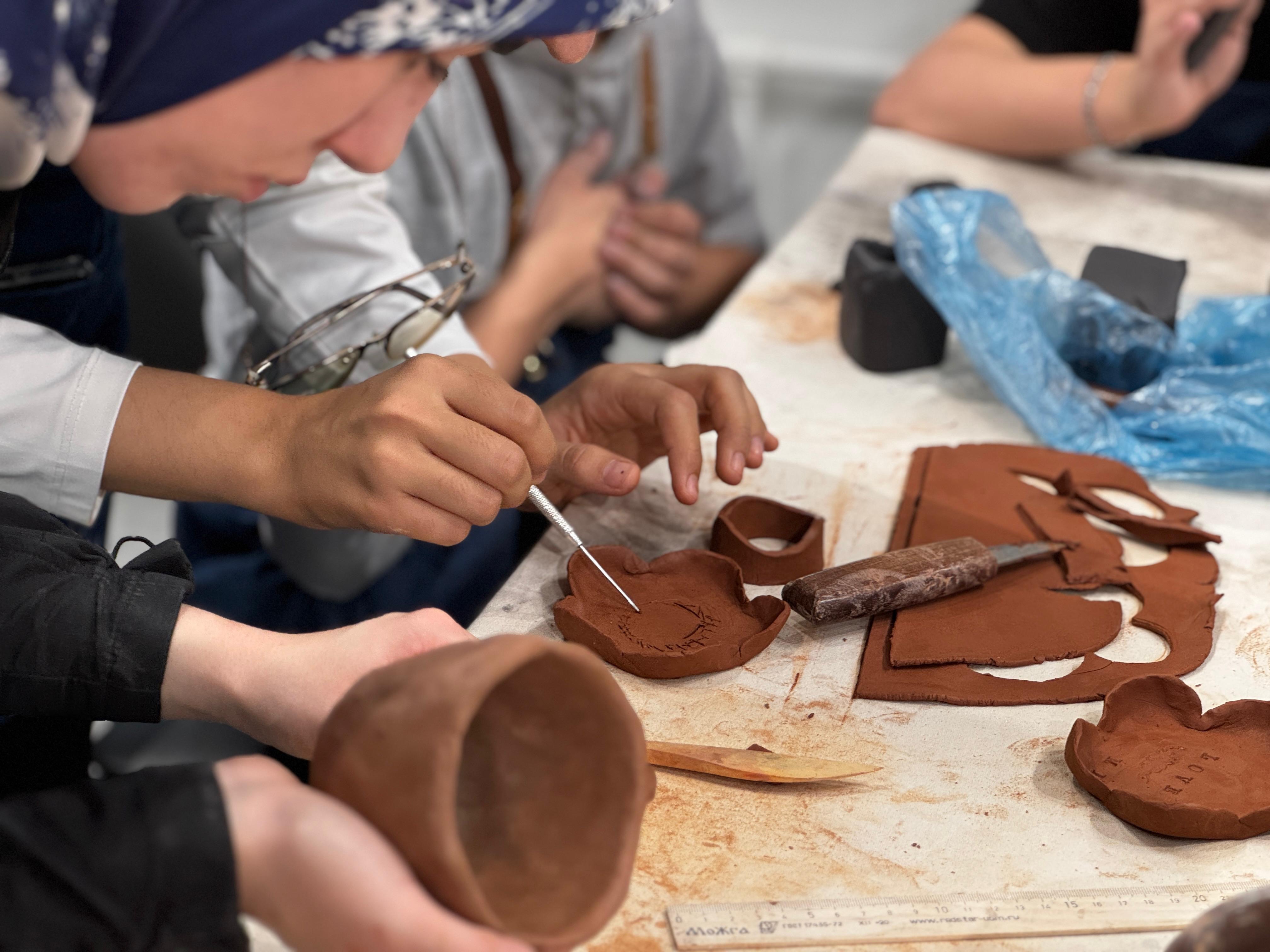Воспитанники ремесленной помогли гостям изготовить изделия из глины ручным способом. Студентам на выбор предлагалось 3 вида изделий: блюдце, кружка или подсвечник. После придания глиняному пласту необходимой формы участники МК декорировали изделия по своему вкусу.